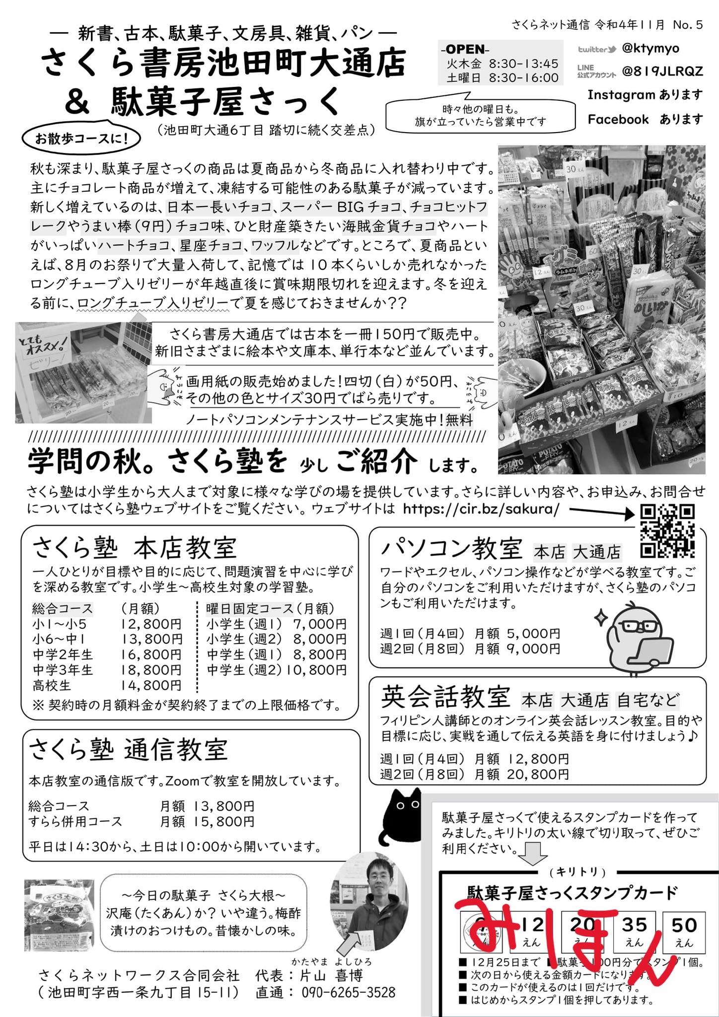 さくら塾、さくら書房、駄菓子屋さっく等、各事業所で共通の通信を発行しています。11月の1回目号です。
