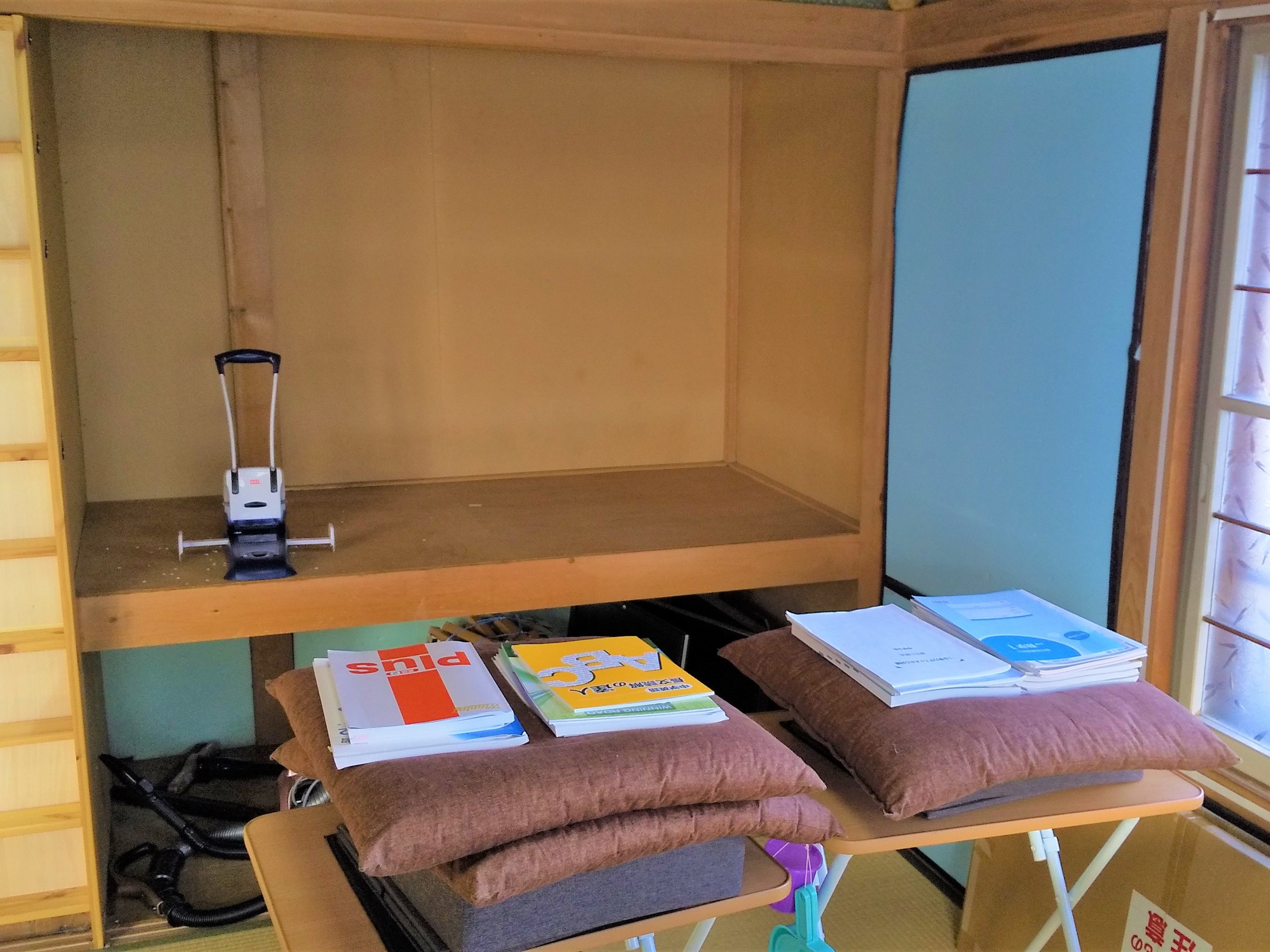 さくら塾の工事が始まります。収納スペースは床補強&断熱工事により書架が設置されます。室内は工事に向けて空きスペースの確保をしています。