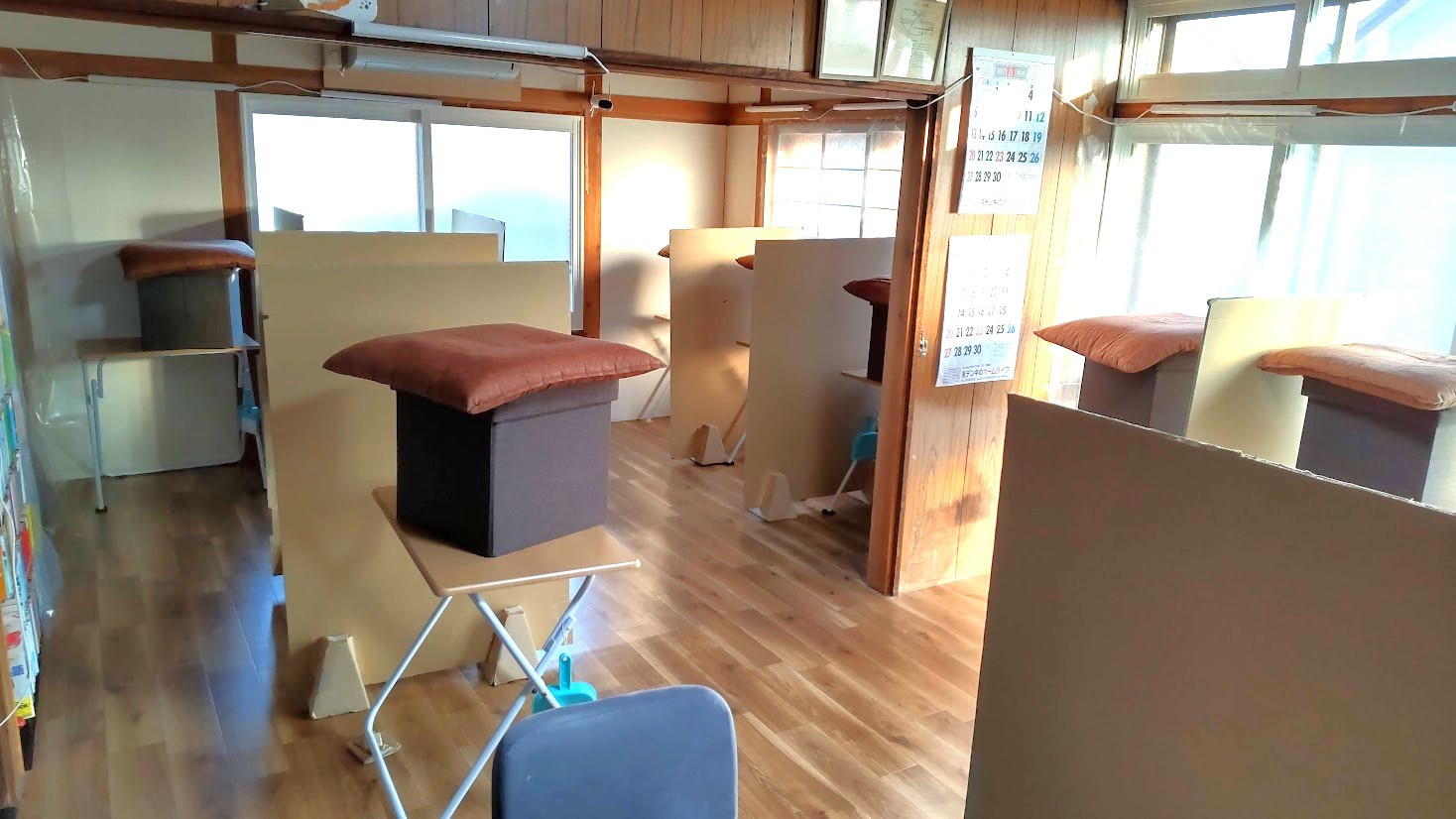 さくら塾本店教室の店内はときどき模様替えをしています。現在は写真のような感じです。冬の寒さに対応するため、通常は3部屋のところを2部屋で営業して、1部屋は仕切って冷気が入らないようにしています。